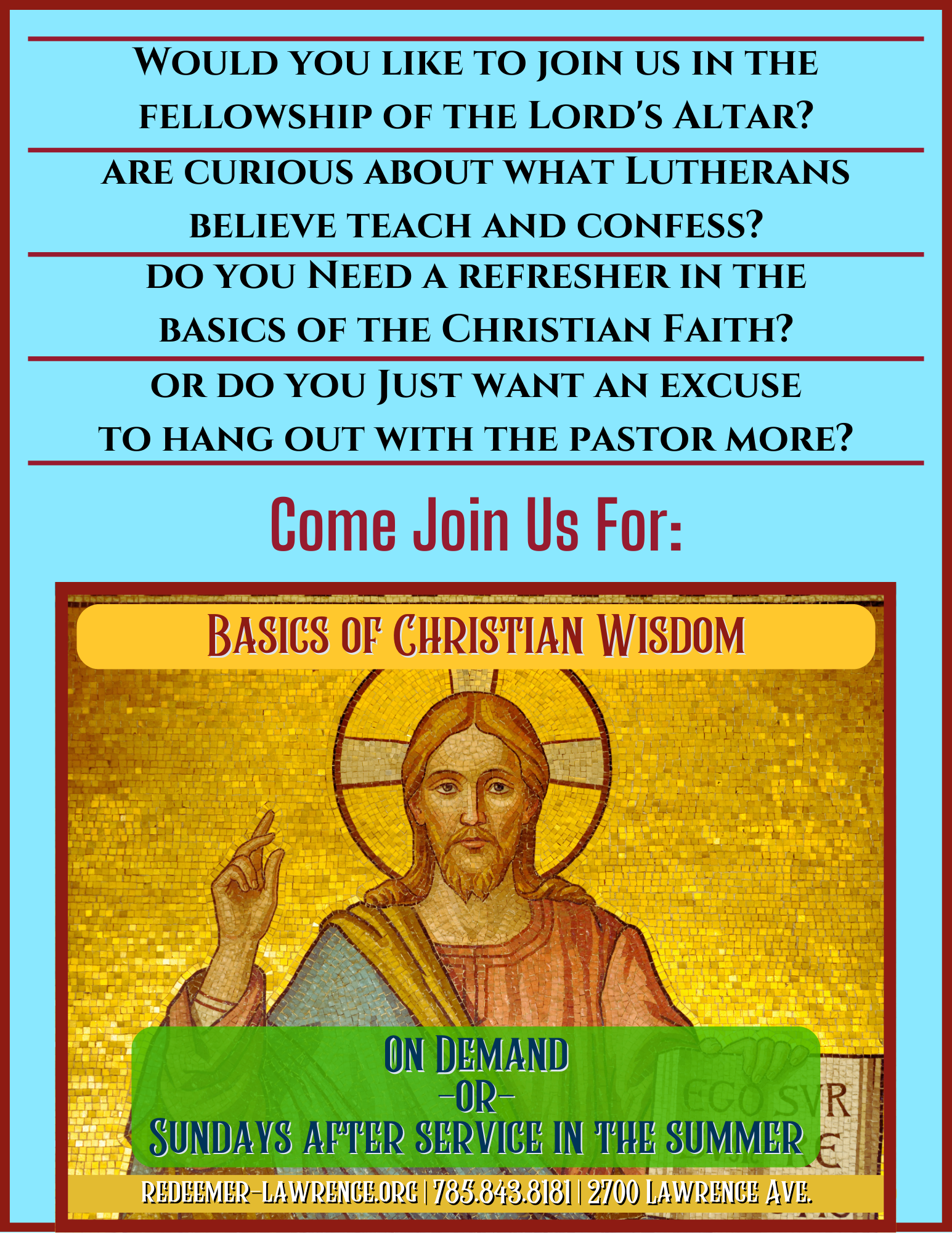 This is a class devoted to covering the basic topics of Christianity. For those looking for a refresher as well as those curious about what we believe.